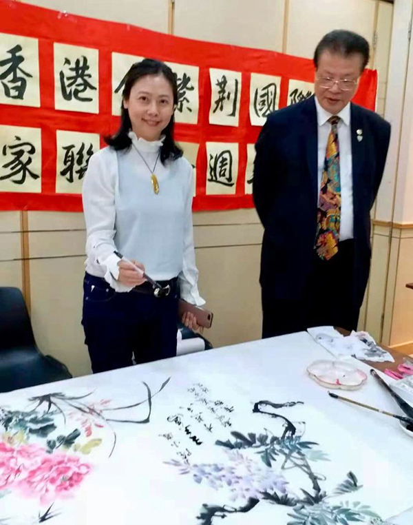 香港金紫荆国际书画家联合会钟丽娟学艺长(右)向香港著名书法家蔡开明先生展示了她的“馥馨幽香图”