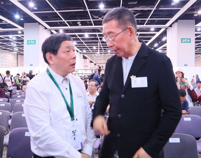 陆惟华博士与老乡董小明教授(深圳美术家协会主席)在展览现场亲切交谈
