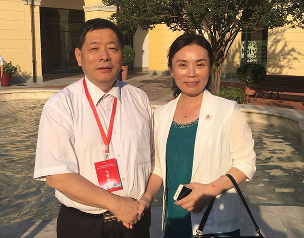 天津市委统战部副部长、天津海外联谊会副会长王禹先生祝比利时陆惟华博士(右)当选天津海外联谊会常务理事