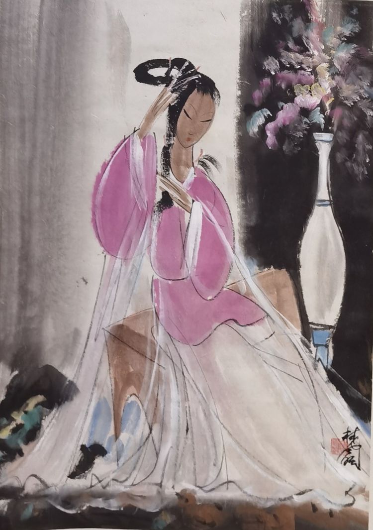 左起:傅抱石作品、香港中信国际拍卖有限公司黄兆基董事长、比利时美术家协会主席陆惟华博士,比利时世界文化艺术交流中心主席、香港国际文化艺术交流联会会长侯杏妹教授在拍卖预展上合影留念