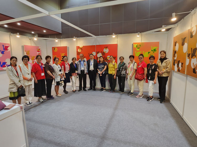 左起:中华两岸(香港)文创观光协会会董皮江红,香港国际文化艺术交流联会副会长梁德玲导师,香港牡丹园书画协会副会长袁悠琴导师,香港中华文化总会吴世娟副理事长,中华两岸(香港)文创观光协会会董董敏芳,中华两岸(香港)文创观光协会会长方秋云会长,比利时世界文化艺术交流中心主席侯杏妹教授,香港中华文化总会创会会长谢纬武教授,比利时美术家协会主席陆惟华博士,香港国际文化艺术交流联会副会长陈小凤(右五),比利时世界文化艺术交流中心主席助理李润萍(右)及香港牡丹园书画协会会员在展览上