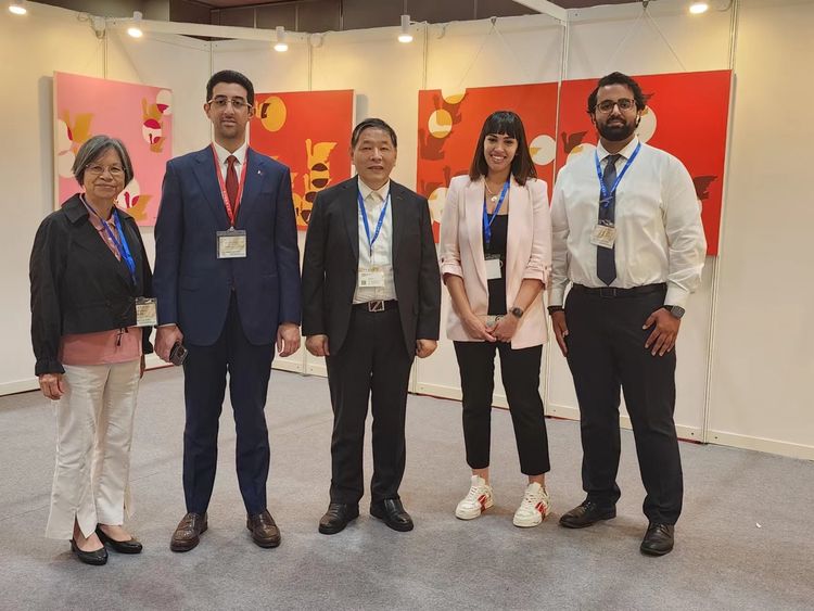 卡塔尔驻香港特别行政区总领事(左二)及官员与比利时世界文化艺术交流中心主席侯杏妹教授(左)、比利时美术家协会主席陆惟华博士(中)及侯杏妹教授作品合影留念