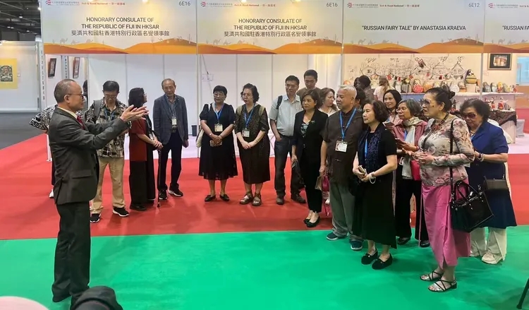 组委会执行主席胡毅超先生召集香港著名艺术家集合,一齐走访各国艺术家展区,进行交流互动