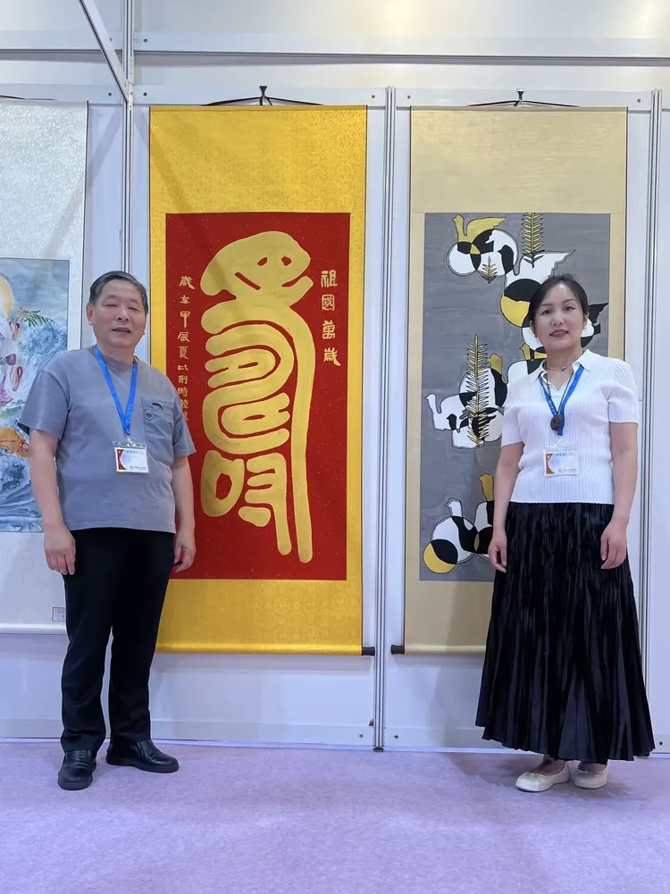 比利时世界文化艺术交流中心主席侯杏妹教授与澳门比利时世界文化艺术交流分中心主席李黎在侯教授的作品合影留念