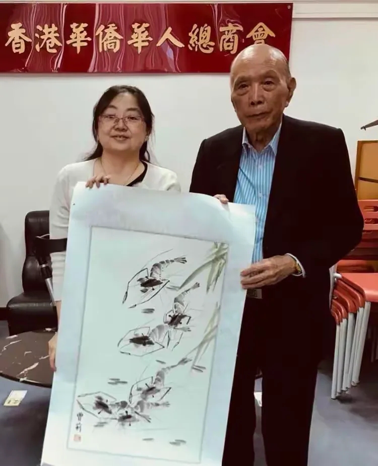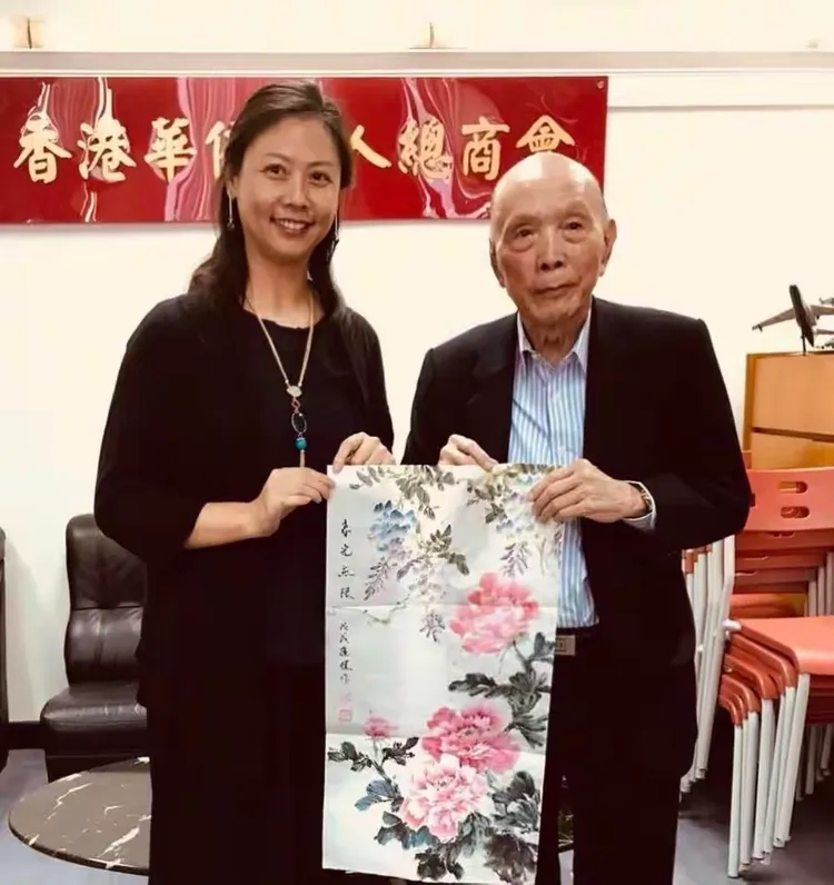 香港牡丹苑畫會主席曾莉向香港華僑華人總商會贈送了自己的墨寶,古會長代表商會接受了作品