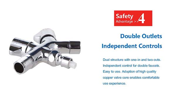 Dual structure with one-in and two-outs. Independent control for double faucets. Easy to use. Adoption of high quality copper valve core enables comfortable use experience.