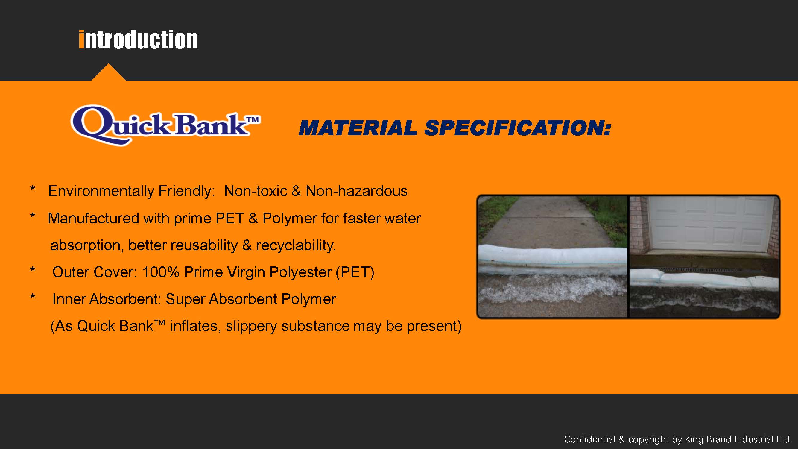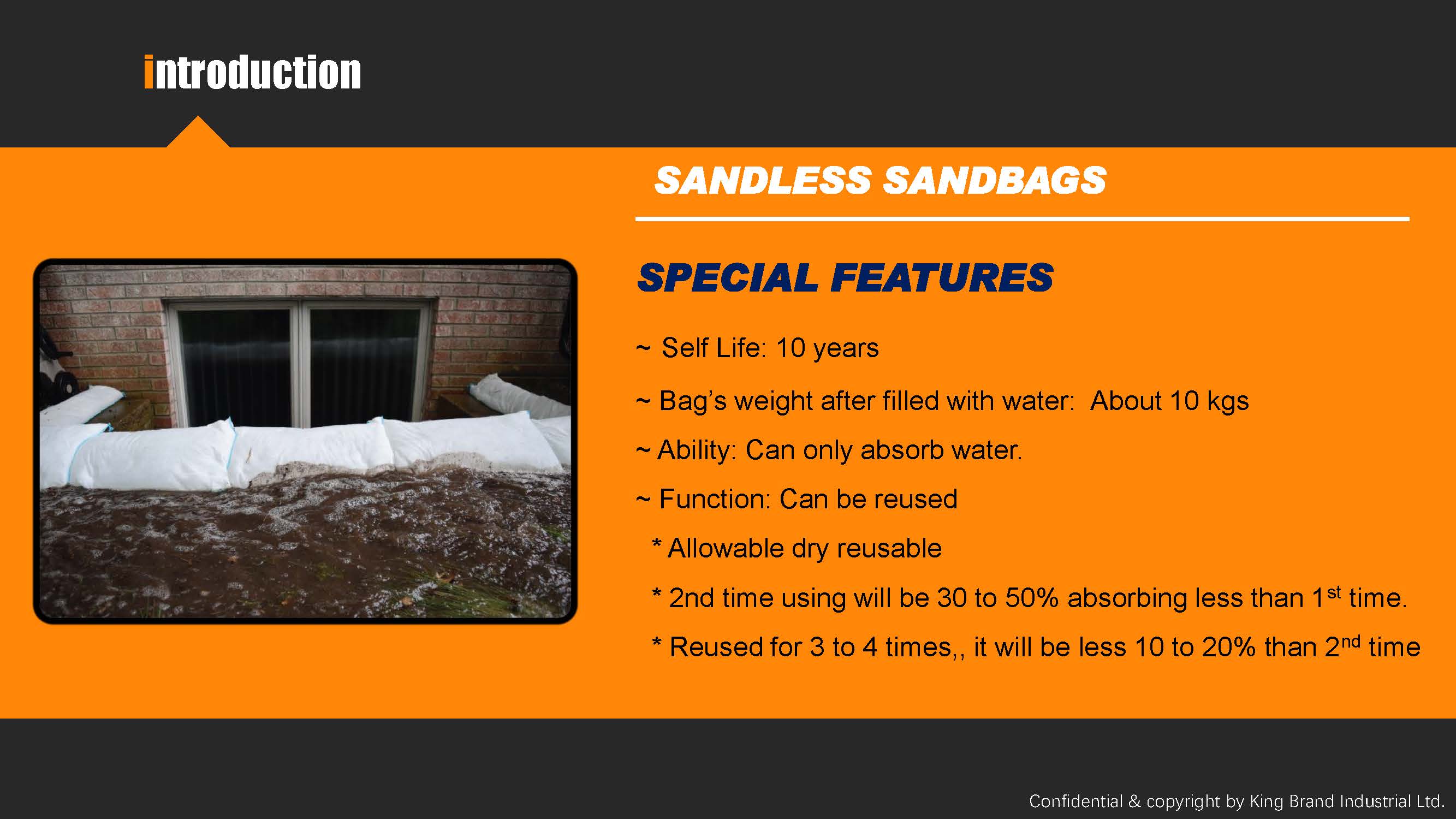 In view of the global warming, there will be more and more typhoons. In order to protect one's property from damage by flood, we develop a “ Sandless Sandbag” to prevent people's property from water damage. Our "Quick Bank™" Sandless Sand Bag is able to absorb 10 kgs of water and this weight of bag is easy to handling even by teenage, petite person and elderly!