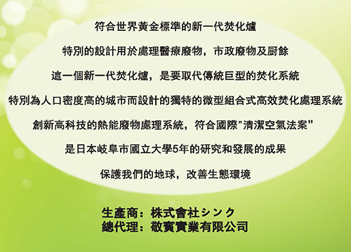 S.I.N.C. 高溫技術,高速處置市政廢物設備 ,特別的設計用於處理 醫療廢物, 廚餘及市政廢物,生態,高溫,高速,焚化,符合世界黃金標準的新一代焚化爐.